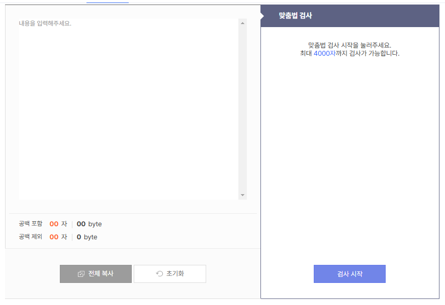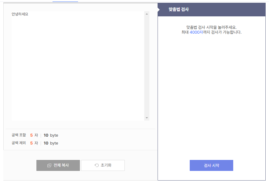 한글, 영문자, 공백, 문장부호 모두 동일하게 1글자로 계산됩니다.