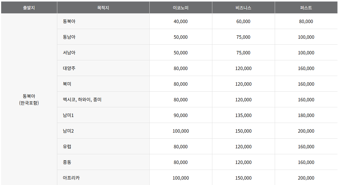 > 웹사이트: 마일리지 항공권과 일치하는 클래스 예약 필수.