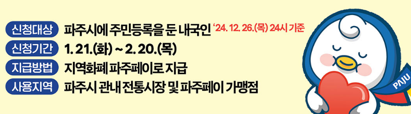 가족과 지역경제를 지원할 수 있는 기회를 놓치지 마세요. 지금 바로 파주시 민생회복 지원금 신청을 시작해 보세요!