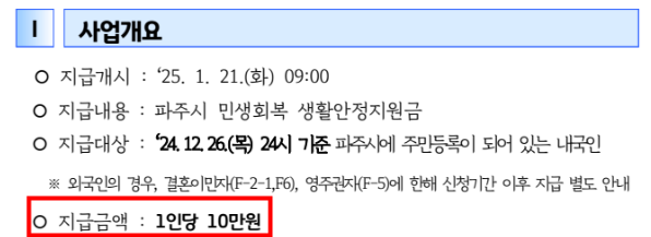파주 민생회복지원금은 파주페이라는 지역화폐로 주민 1인당 10만 원의 금융지원을 제공합니다. 이번 지원금은 2024년 12월 26일 기준 파주시에 등록된 모든 주민을 대상으로 지원되며, 폭넓은 구호기금 이용이 가능하도록 지원됩니다.